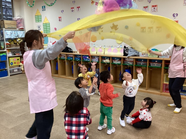 リトミックスカーフでみんなで遊ぶわかばさん♬ お昼ごはんも園で食べて、分離保育にも慣れてきたね(^^)