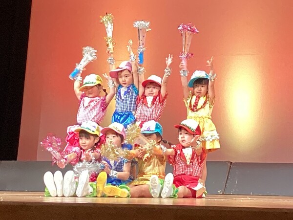 年少さんはミャクミャクのかわいいお面をつけて、お遊戯を踊ります♬  たくさんの観客の皆さんの前でおどることができましたね(^^)v